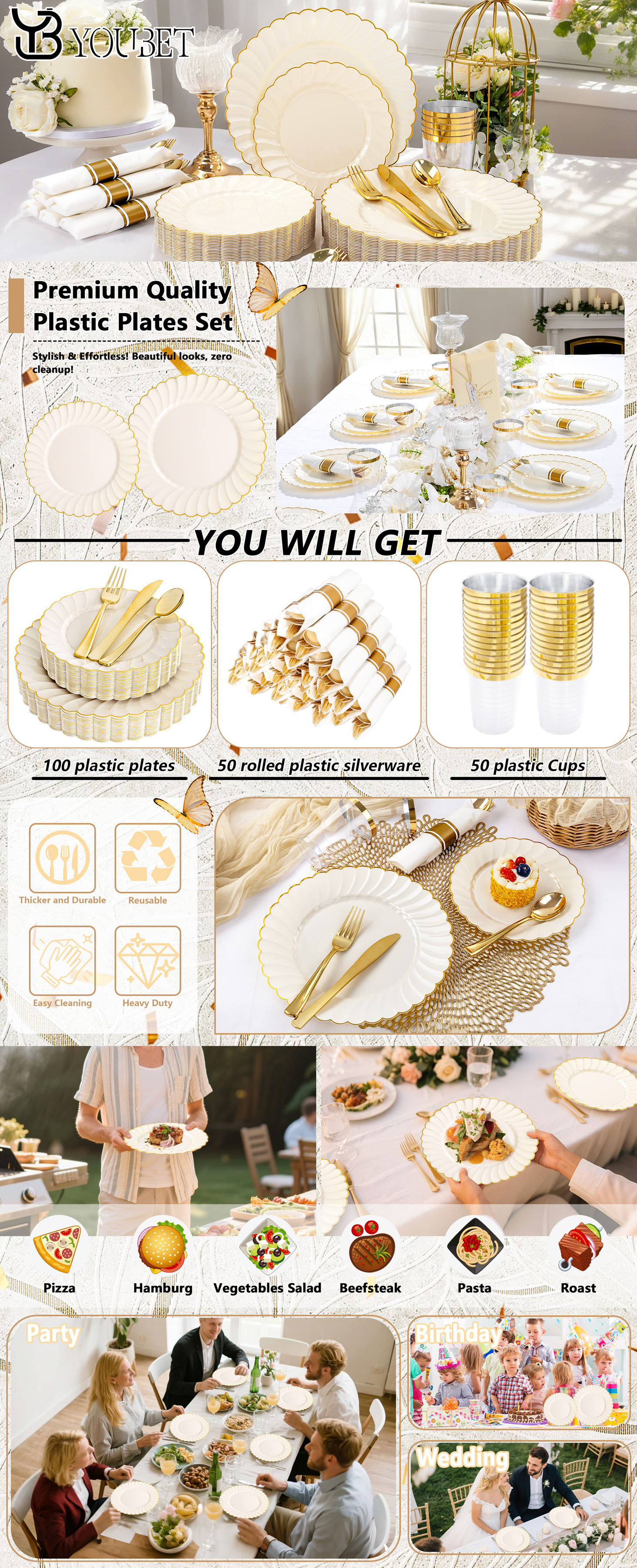 350PCS Ivory Scalloped Plastic Plates - Ivory and Gold Disposable Dinnerware Set Include 100 Plates, 150 Gold Silverware, 50 Cups, 50 Napkins for Wedding & Party