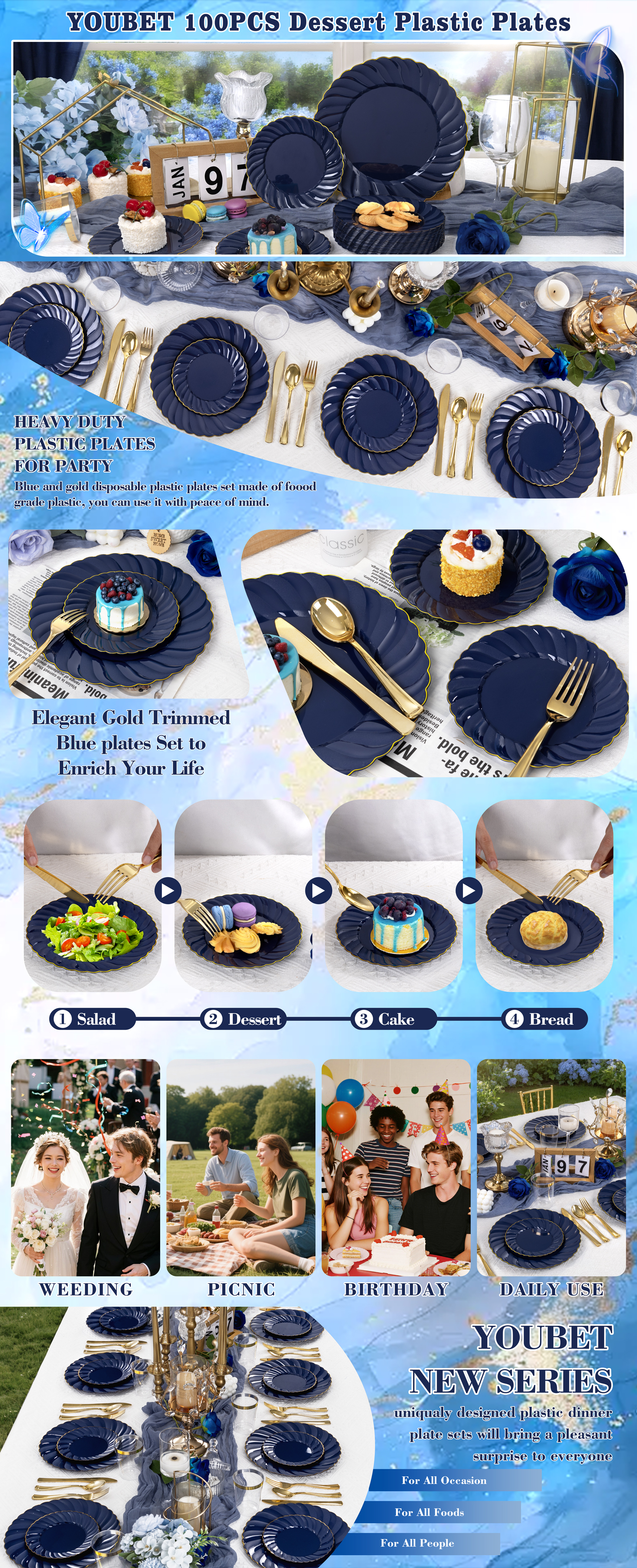 YOUBET 100 Pack Blue Scalloped Plastic Plates - 6.5 Inch Navy Blue Disposable Plates - High End Elegant Vintage Dessert Plate for Party & Weeding & Birthday