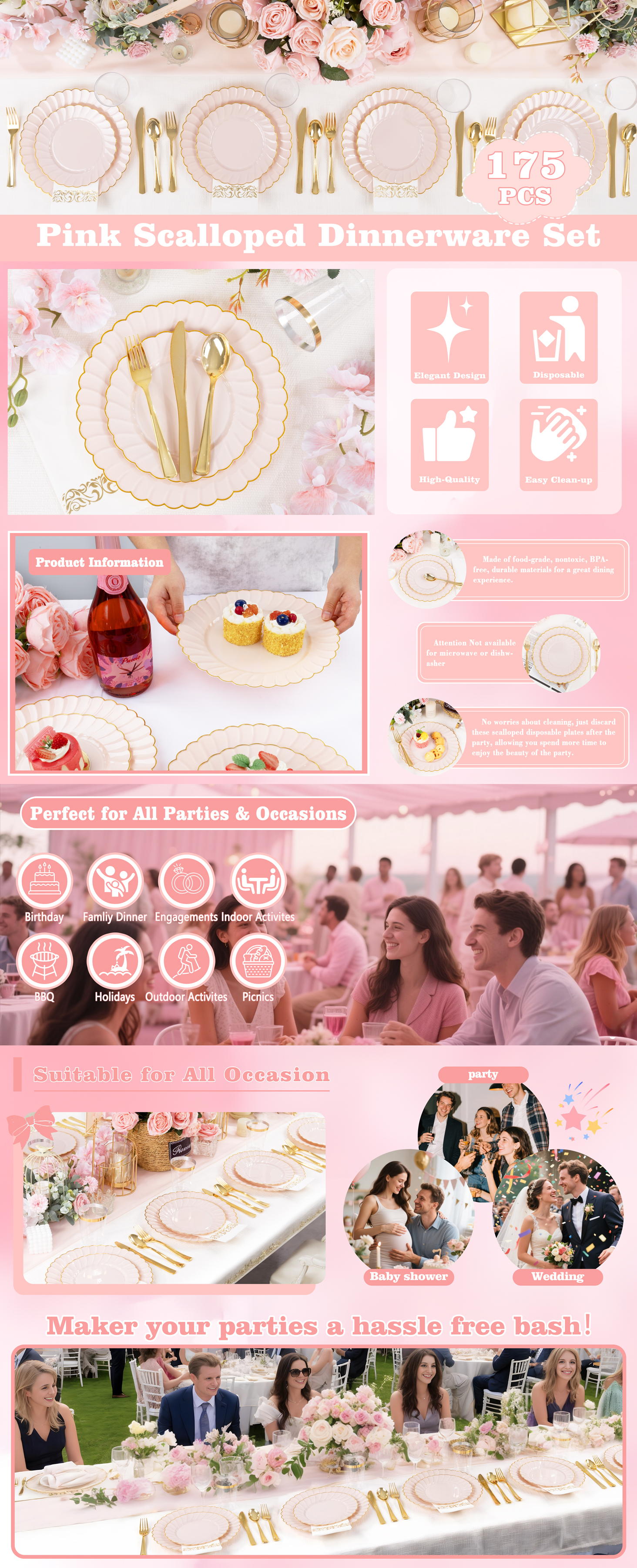YOUBET 175PCS Pink Scalloped Plastic Plates - Gold Disposable Dinnerware Set Include 50 Plates, 75 Gold Silverware, 25 Cups, 25 Napkins for Party & Wedding & Baby Shower