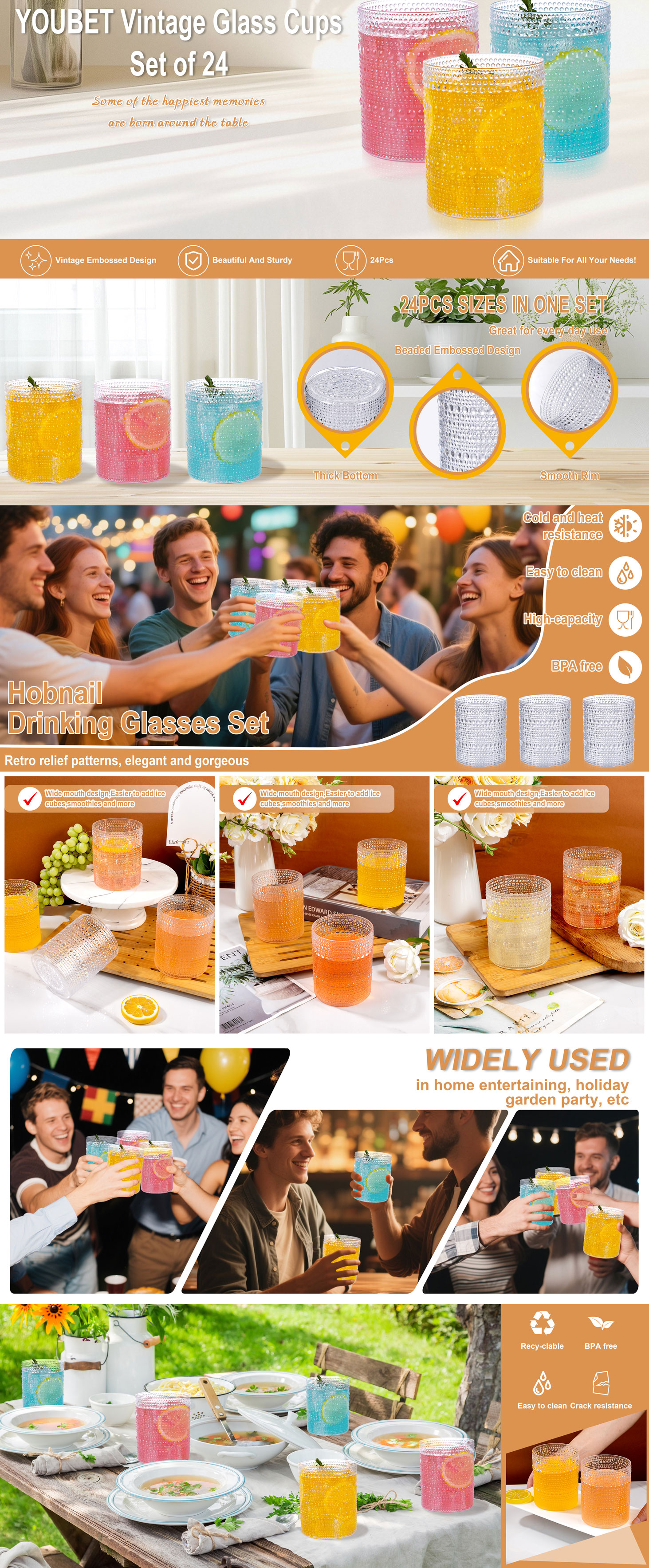 YOUBET 24PCS Plastic Hobnail Drinking Glasses - 14 Oz Clear Vintage Glasses Drinkware - Disposable Beaded Cups for Juice, Wine, Party