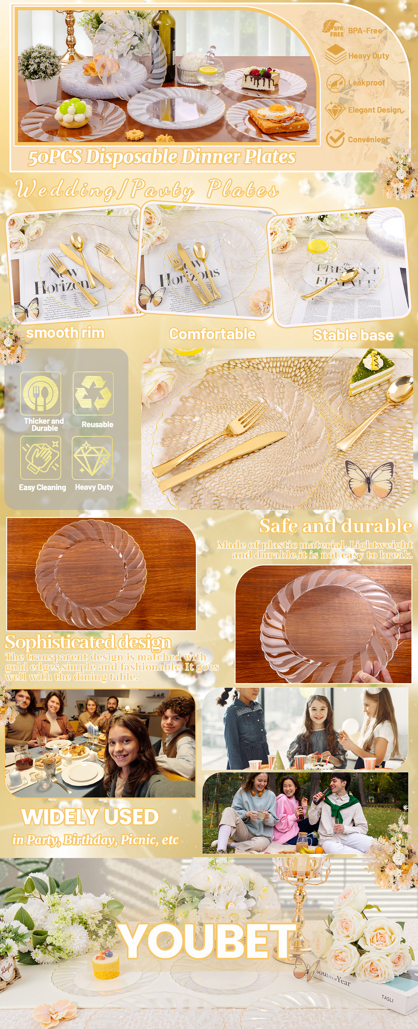 YOUBET 50 Pack Clear Scalloped Plastic Plates - 10.25 Inch Clear Gold Disposable Plates - High End Elegant Vintage Dinner Plate for Party & Weeding & Birthday & Thanksgiving