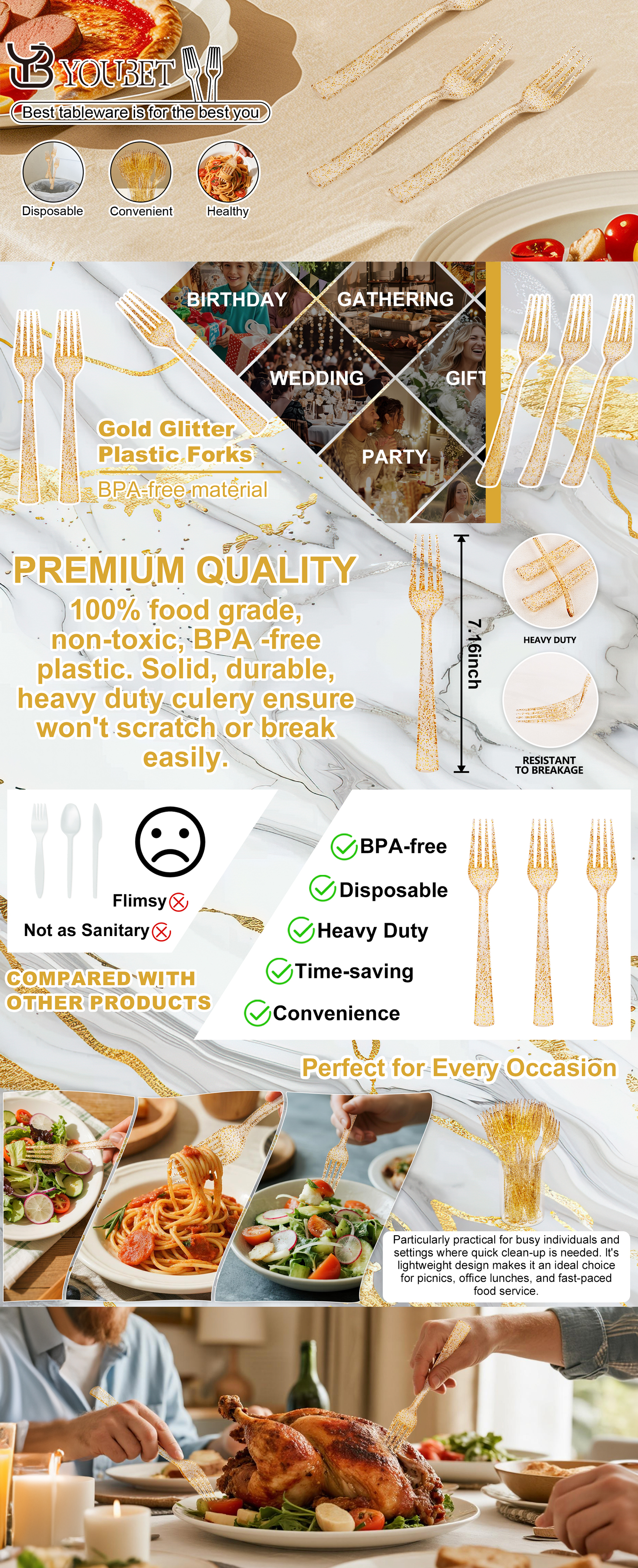 YOUBET 50PCS Gold Glitter Plastic Forks - Heavy Duty Plastic Forks - Solid Durable Gold Glitter Disposable Silverware for Party Picnic Wedding and Daily Use