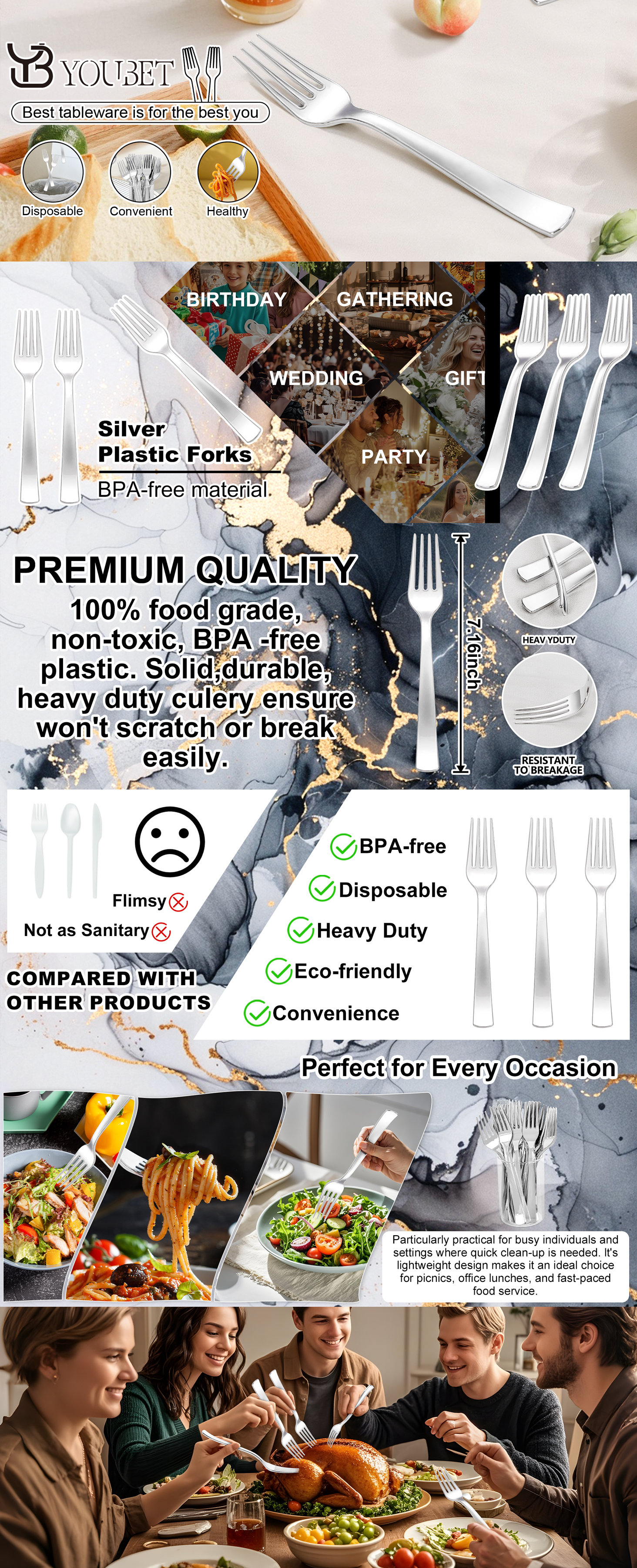 YOUBET 50PCS Silver Plastic Forks - Heavy Duty Plastic Forks - Solid Durable Silver Disposable Silverware for Party Picnic Wedding and Daily Use