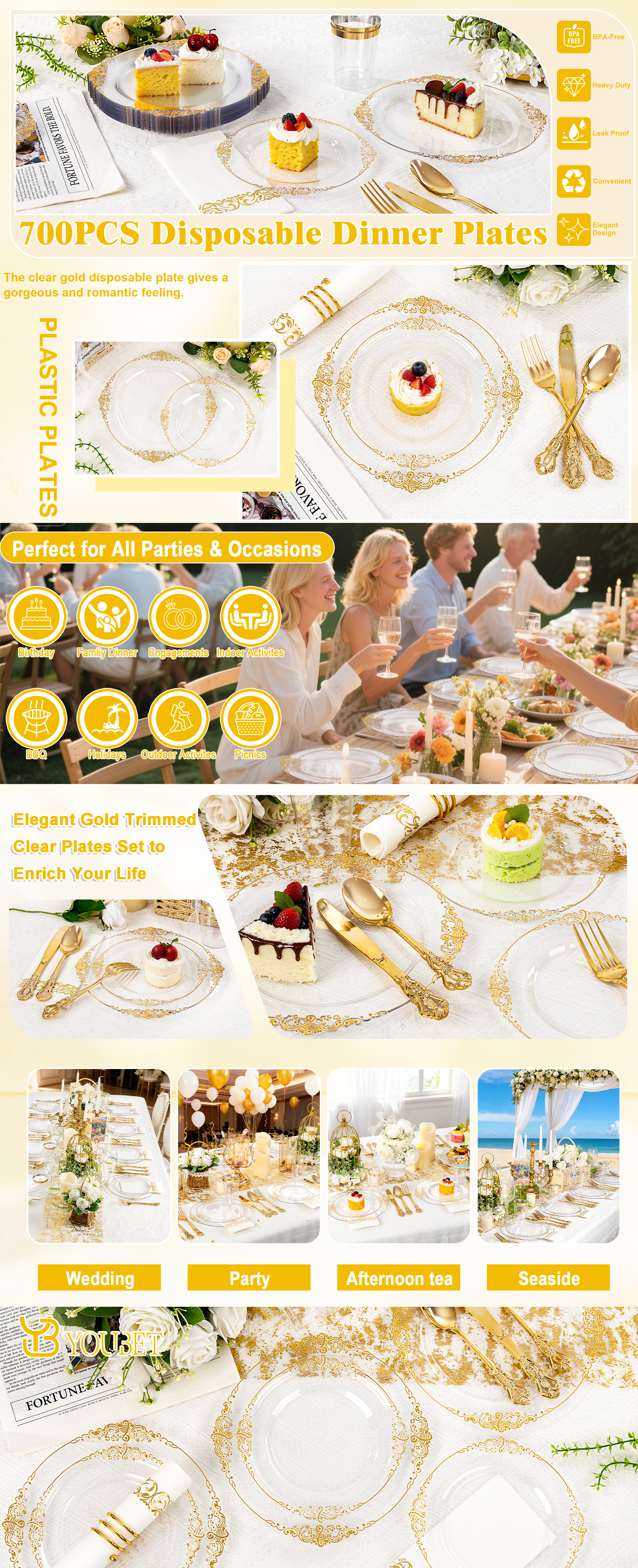 YOUBET 700PCS Clear Gold Plastic Plates - Elegant Gold Plastic Dinnerware Set Include 200 Disposable Plates, 300 Heavy Duty Silverware, 100 Cups, 100 Napkins for Wedding Party & Thanksgiving